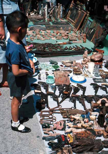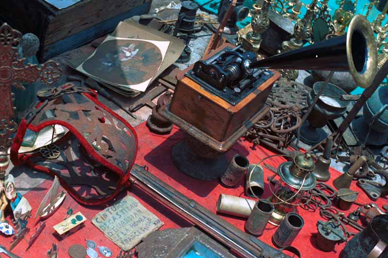 ラグニージャ市場。何処から盗んできたのか本当の骨董品が山積み。蝋管式の蓄音機と中世期の貞操帯がみえます(これは後日アシエンダ ガビアの所蔵品となり再会しました)