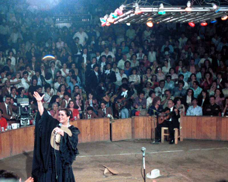 当時現役で最も有名だった歌手。グアダラハラの闘鶏場での演奏会です。観客は興奮すると座布団ならぬソンブレロを投げました。彼女はうまく受け取って投げキッス。ランチェロの女王と言われ切手にもなってます