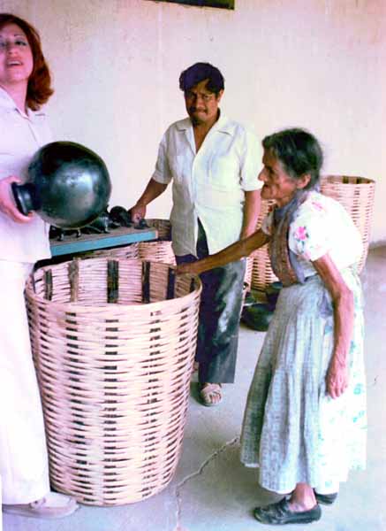 黒陶器の元祖と言われ、今では銅像にもなっているドニャ・ロサ。壷の製作実演の後は、自ら売り子に変身します(77年)。