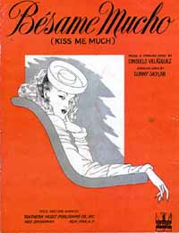 発表当初はボレロではなかったともいわれるが、この曲が世界的に広く知られるようになったのは、メキシコ本国よりアメリカで大きな評判をとったからでもある。最初のヒットは1942年、「アマポーラ」「ブラジル」「グリーン・アイズ」など新旧のラテン名曲に英語詞をつけてスウィング・アレンジで次々にヒットさせていたジャズ畑のジミー・ドーシー・オーケストラのレコードだった。スカイラーによる英語詞は原詞に比較的忠実で、 Besame, besame mucho... Each time I cling to your kiss, I hear music divine さらに翌年メキシコ出身の美男歌手として1940年代のハリウッド映画にも多数出演したアンディ・ラッセル(ルーセル)の英語バージョンもヒット、折しも戦争真っただ中のアメリカでこのメキシコ発のロマンティック・ソングはヒットしたのだ(アメリカ版楽譜表紙の隅にも「戦争債券を買って勝利に貢献しよう」なんて書いてある)。 日本では、この戦争があったために1941年以降のヒット曲は戦後しばらく経つまで輸入されず、「ベサメ・ムーチョ」も5〜6年遅れで進駐軍放送(現在のFENのもと)を通じて聞かれ始めたという。やっと1950年になって日本語詞が付き「ベッサメ・ムーチョ」として黒木曜子が歌った盤(タンゴ・バンドの早川真平とオルケスタ・ティピカ東京が伴奏、形式はルンバ)が発売され、ヒットとなる(上写真右が当時の日本発売楽譜表紙)。 「ベサメ ベサメ・ムーチョ 燃ゆる接吻(くちづけ)を交す度 ベサメ・ムーチョ いつもいつも流れる曲(しらべ)」 同じ頃、それまで進駐軍放送でよく流れていたアメリカのラテン王、ザビア・クガート・オーケストラの演奏も日本で発売された。クガートのムーディなスタイルにニタ・デル・カンポが甘いスペイン語の歌を入れ、後半には原曲にないテンポをあげたパートがくっついているもので、戦前のルンバ演奏とは異なる流麗なスタイルはさぞ新鮮だったことだろう。 しかし日本人にとってこの曲の決定版は何と言ってもトリオ・ロス・パンチョス。でもパンチョスにとってこのレパートリーは偶然の産物であった。1945年に結成されたこのトリオは、アメリカ発の対中南米ラジオ放送でスターダムにのし上がり、1950年頃から中南米諸国を回る長期ツアーに出ていた。ところが途中でトップ・ボイスのエルナンド・アビレスが意見の対立から脱退することになり、残った2人は慌ててペルー滞在時に目をつけていたボリビア人ボレロ歌手、ラウル・ショウ(シャウ)・モレーノを呼び寄せ、残った公演を何とか新メンバーで消化することにした。とは言え、すでに中南米諸国でのパンチョスの人気は高く、長いツアー中でも新しいレコードを出さないわけには行かない。そこで苦肉の策として、すでにある程度知られたレパートリーを入ったばかりの助っ人ラウル・ショウをトップにアルゼンチンで録音した。その中に偶然「ベサメ・ムーチョ」があったのだった。 この時の録音には「キエレメ・ムーチョ」「ソラメンテ・ウナ・ベス」などすでに知られ始めていたラテンの名曲が多く、日本ではこれらのレコードがパンチョス初紹介のレコードとなった経緯もあって大いにヒットした。 1959年、ジョニー・アルビーノをトップ・ボイスに迎えたばかりのパンチョスは初来日を果たし、そこで「ベサメ・ムーチョ」を再録音、日本のこの曲の人気を決定的なものにした。最近のパンチョス(もうメンバーは変わっているがトップ・ボイスはアルビーノが特別参加している)のコンサートでも、パンチョス独自のイントロを弾き始めただけで拍手が来るのだから、どれほど多くの人に知られていたか想像がつこうというものだ。 有名になった曲は独り歩きを始めるものだ。パンチョス系のトリオはもちろんこぞってとりあげているが、フルバンド・オーケストラによるルンバ、マンボなどのアレンジ、タンゴやボサノヴァ・アレンジ、はたまた音楽のこぎり(ミュージカル・ソウ)や琴・尺八 による演奏まで、軽く300種類は越えようかという数の録音が残されている。アート・ペッパーの名演奏を始め、ジャズのスタンダード・ナンバーとしても通用している。 しかしこの曲、実は一般に思われているようなベタベタ・カップルの甘〜いラヴ・ソングではなかったのである。音楽レポーターの竹村淳氏があるCD解説にこう書いている−:「ところが数年前メキシコ市で耳にした話によると、『ベサメ・ムーチョ』はベラスケスさんの女ともだちの夫が入院中なので見舞ったとき、容態が思わしくなく、自分の最後が近いことを悟っていた病床の夫君が夫人に『たくさんキスして』とせがんだということを聞いて作った歌だというのである。」(かたりべしゃ CLS-002 ベサメ・ムーチョ〜ポ ンチョの新しい世界/レイ・アルフォンソ正田 CDライナーより) この曲には作者コンスエロ・ベラスケスによる自作自演も存在する。いずれも歌なしのピアノ演奏(リズム伴奏付き)のみで、1955年頃のRCA盤が最初だろう。