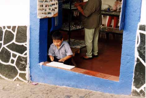 銀の町・タスコで出会った少年は、お店の入り口でせっせと宿題に精を出していました。